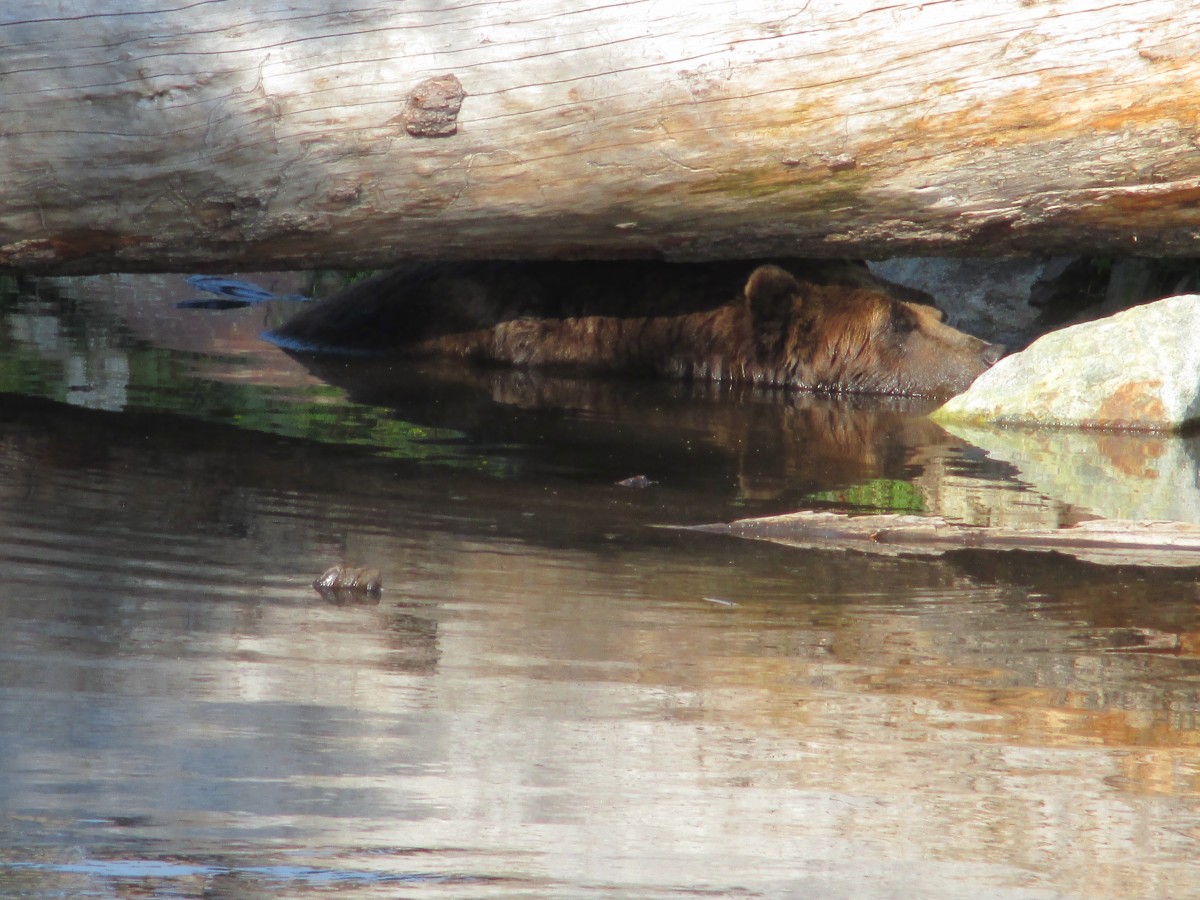 Oben angekommen machte ich dann im Schatten Rast, um dann anschließend die Vogel-Show und die Grrizlybären zu bewundern. Die Bären hatten sich aufgrund der Hitze in den Bach in ihrem Gehege verzogen und genossen das kühle Wasser.